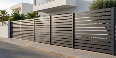 Valla metálica de perfiles verticales gruesos que combina privacidad parcial con paso de luz. Su ritmo visual aporta elegancia y un carácter arquitectónico marcado, ideal para viviendas modernas.