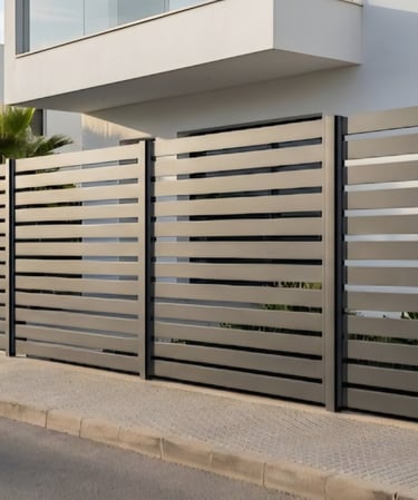 Valla metálica de lamas horizontales planas con separación uniforme. Un diseño minimalista y equilibrado que permite el paso de luz y aire, muy integrado en viviendas de estilo contemporáneo y entornos residenciales mediterráneos.
